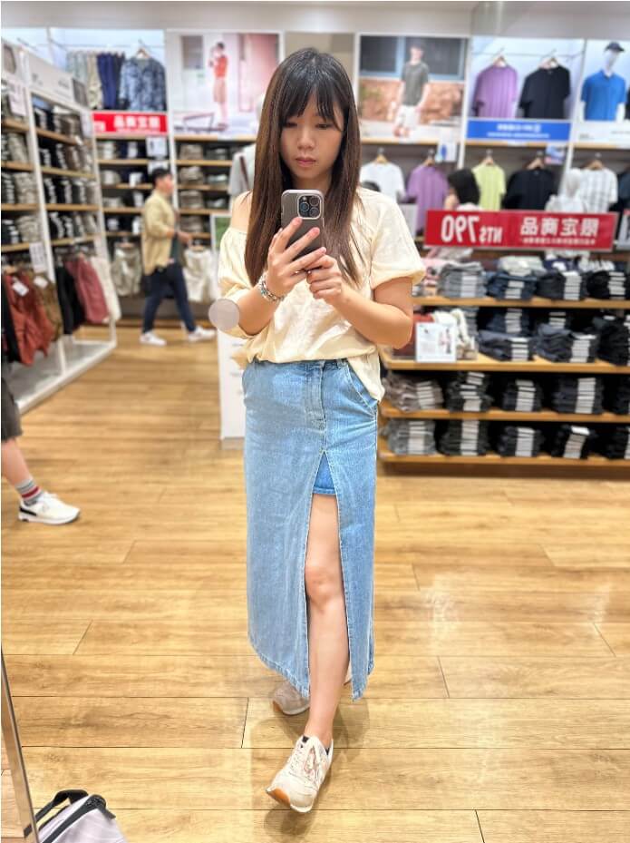 闆娘這件下身搭配的是”不怕走光的小性感個性側開岔牛仔褲裙” 百搭的開岔牛仔長裙裡還有一件小短裙,活動自如又完全不會走光♥
