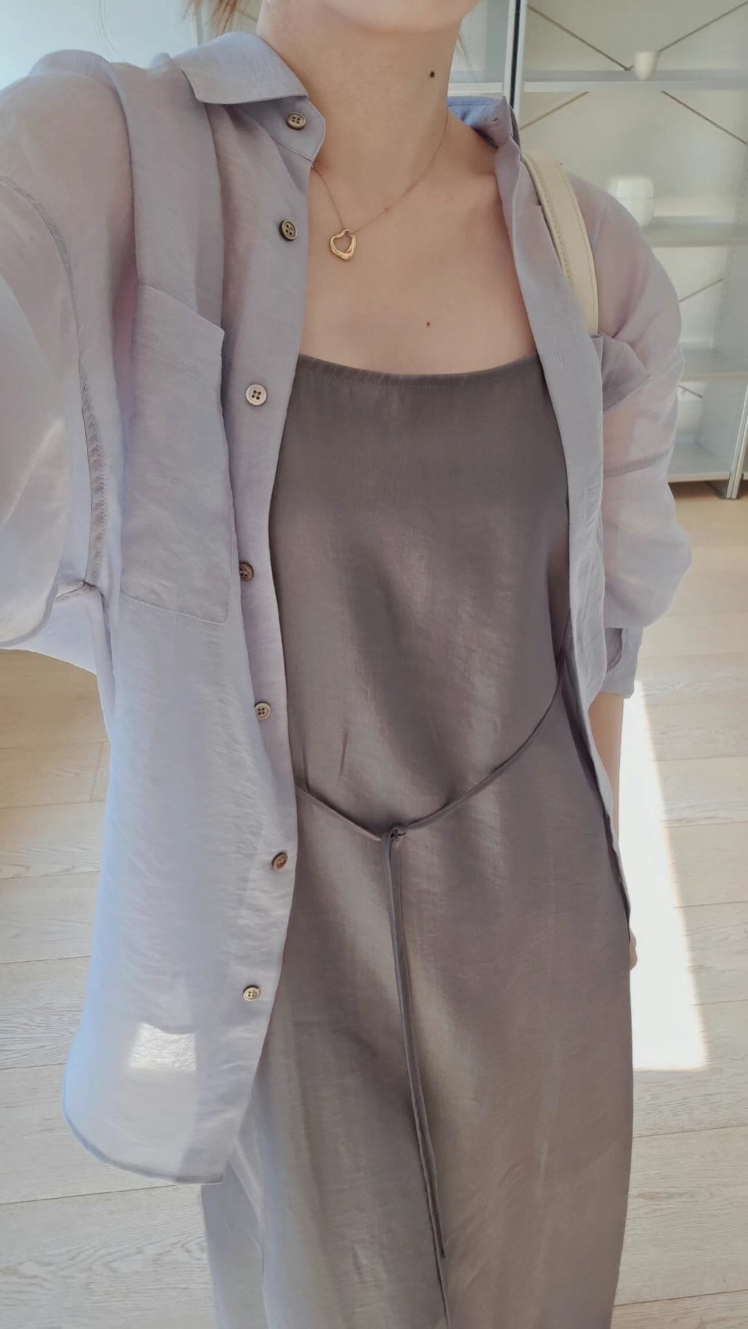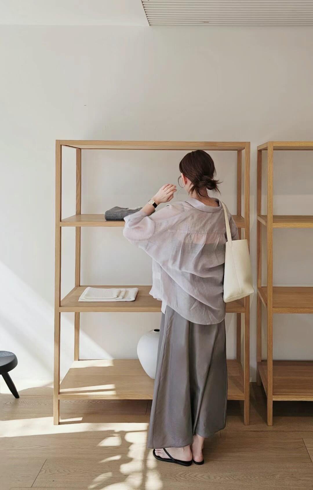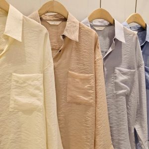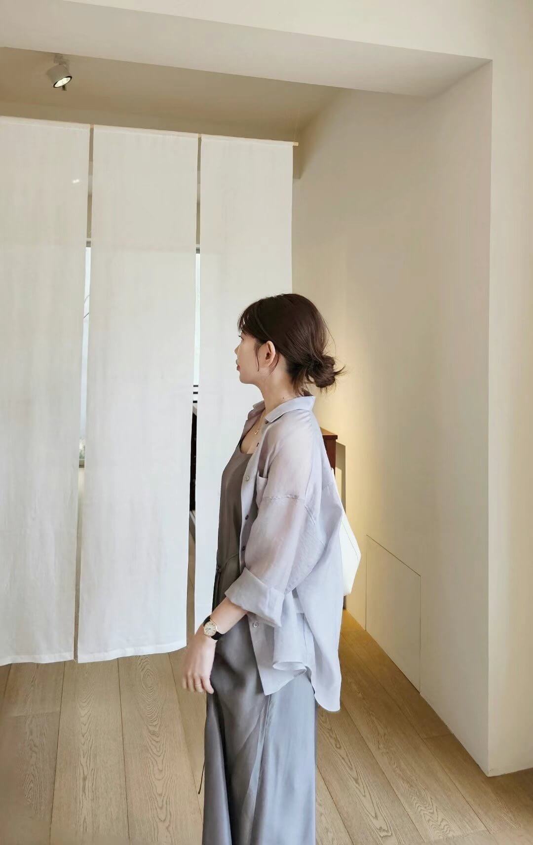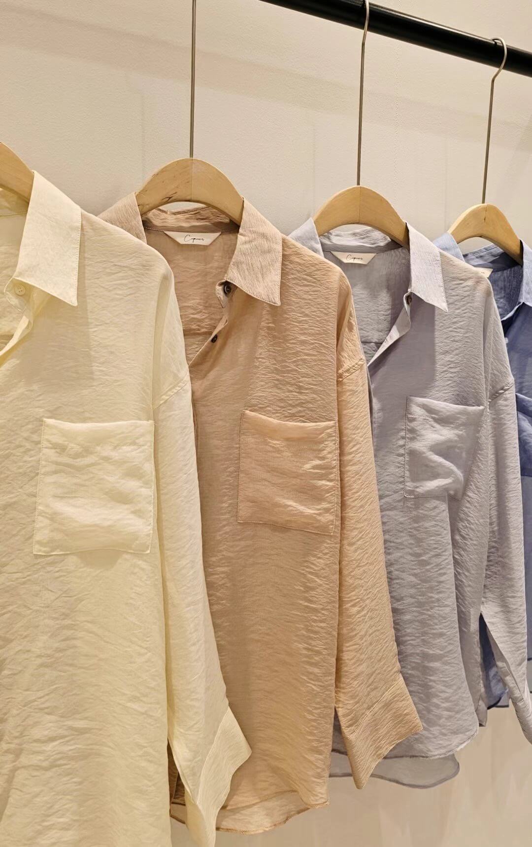 襯衫的布料帶有微皺的紋理感和霧霧的光澤