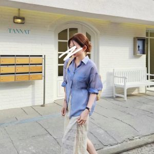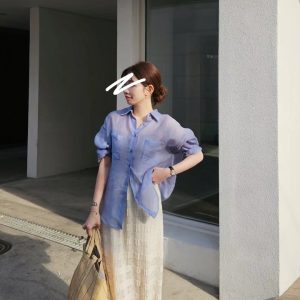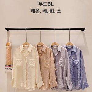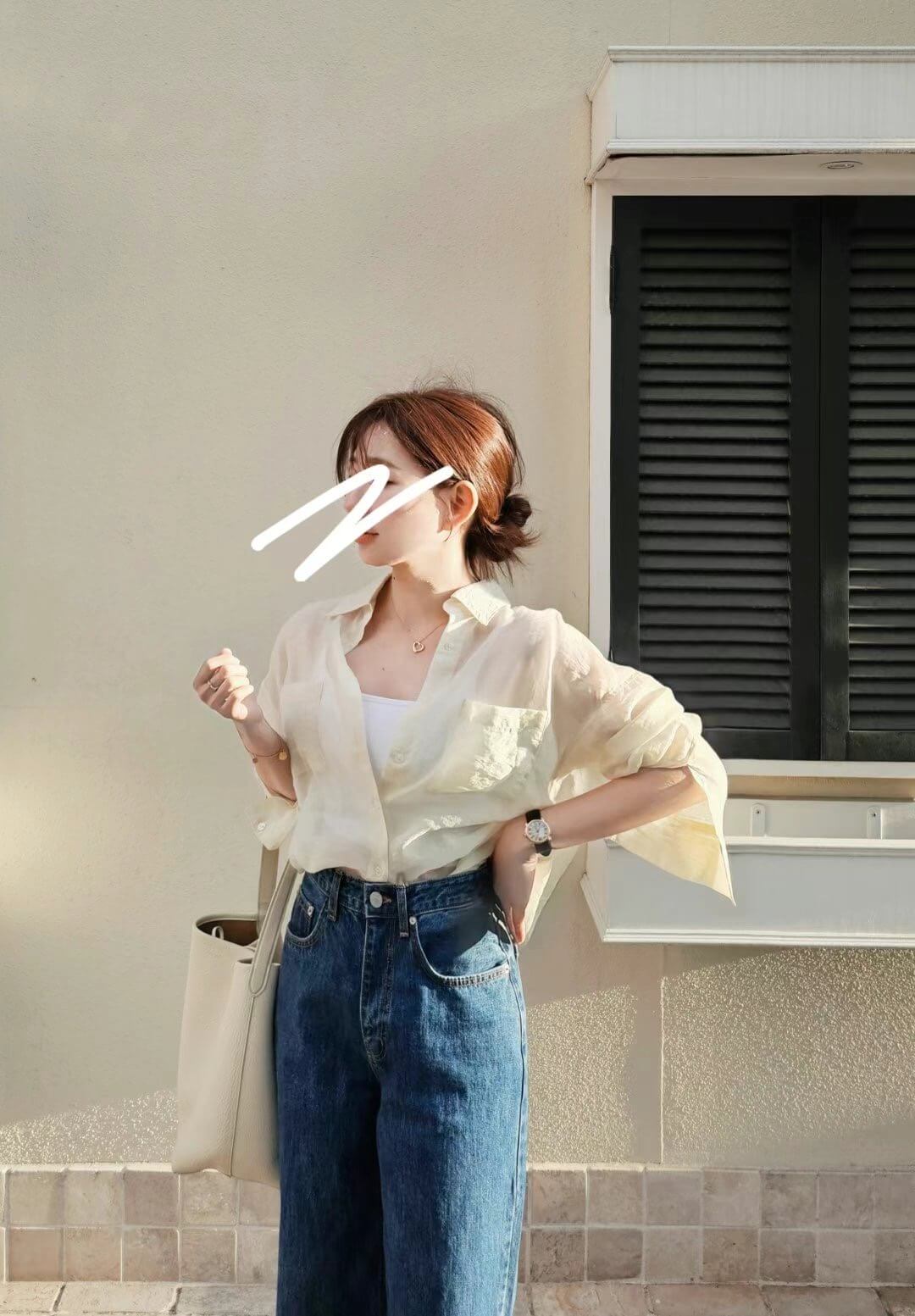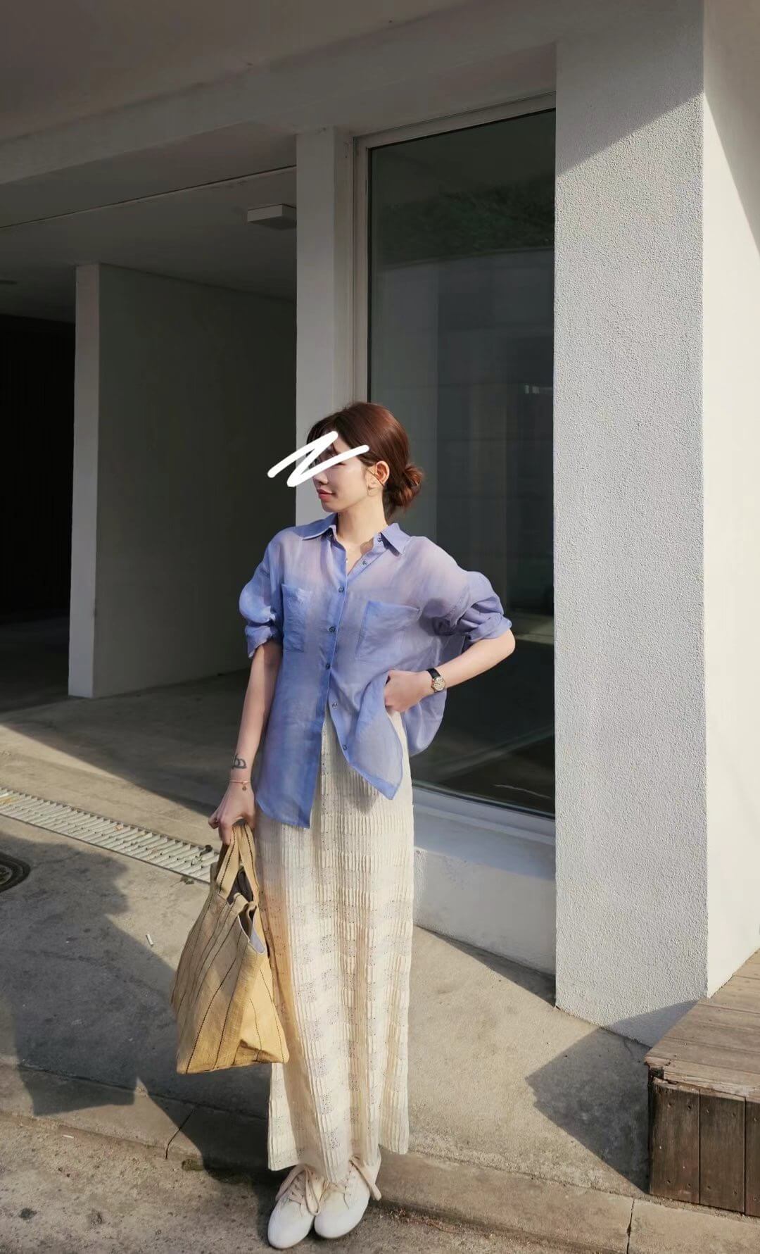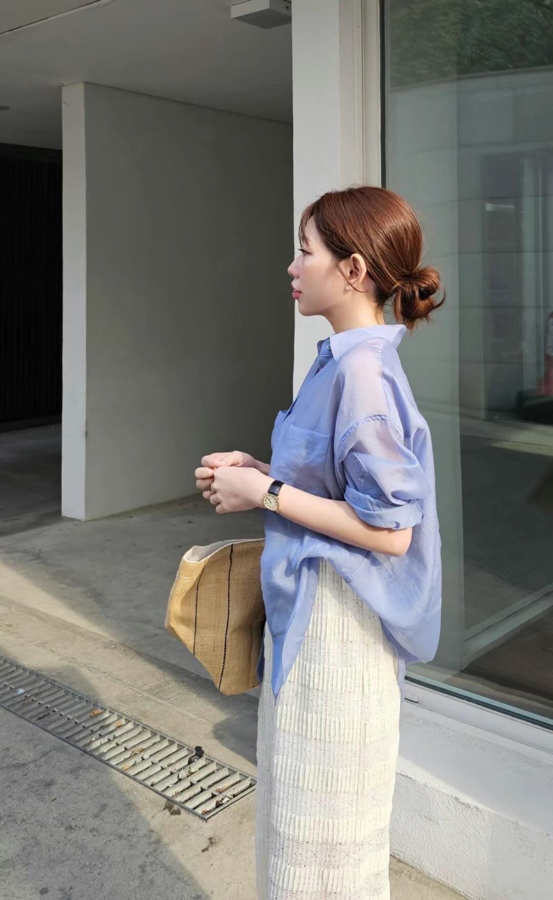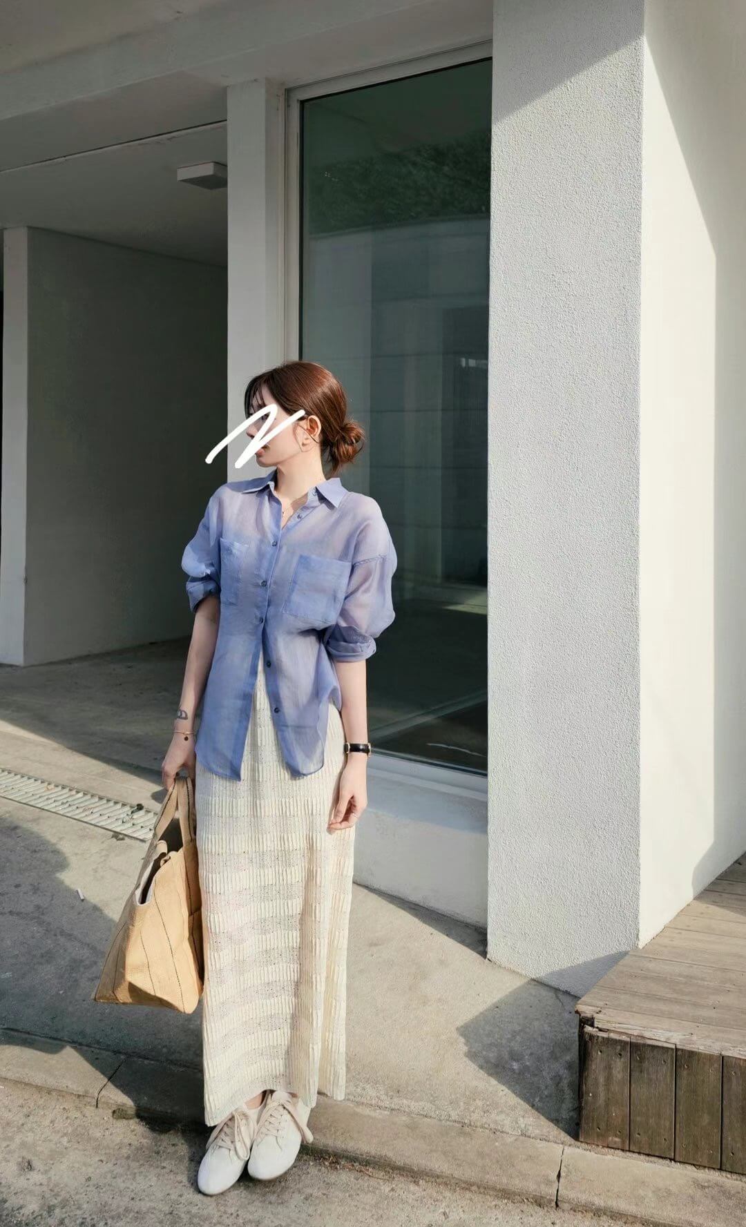 襯衫的布料帶有微皺的紋理感和霧霧的光澤