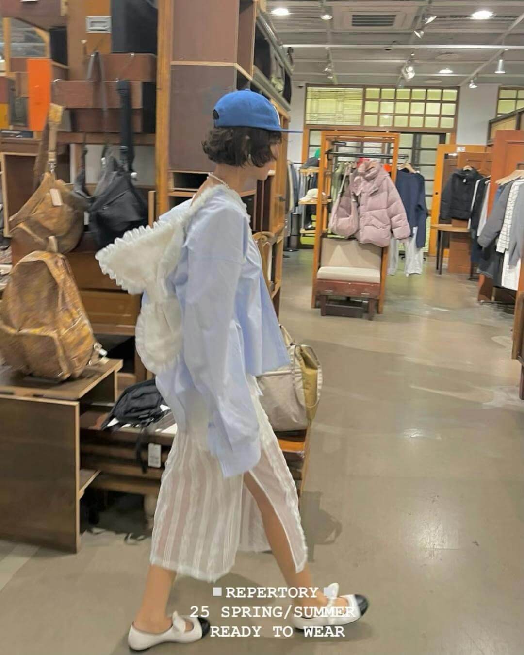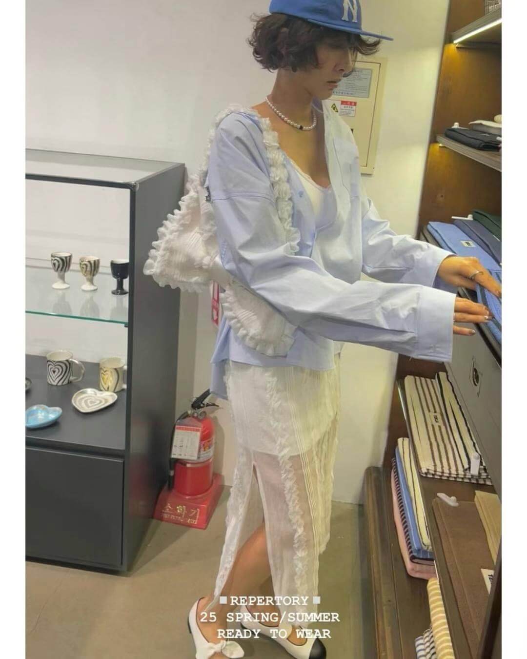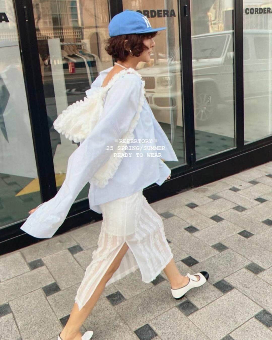 裙子布料微透但有內裡,側邊有開岔,行走時不經意露出小腿,給人不過份的小性感。
