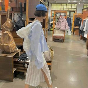 版型是窄版的鉛筆裙,腰頭是鬆緊帶,豎紋的紋理感再加小布蕾絲在裙子上點綴,給人優雅又溫柔的感覺。