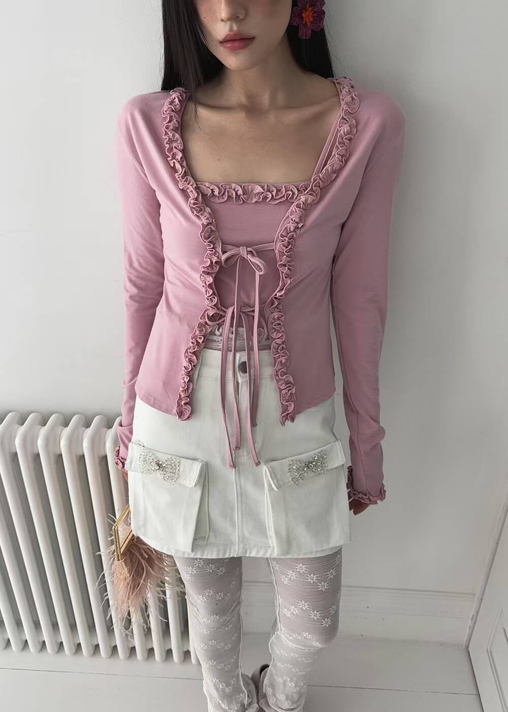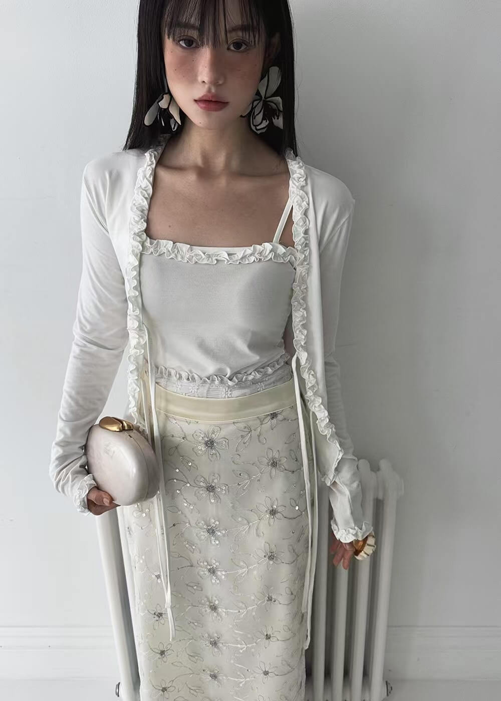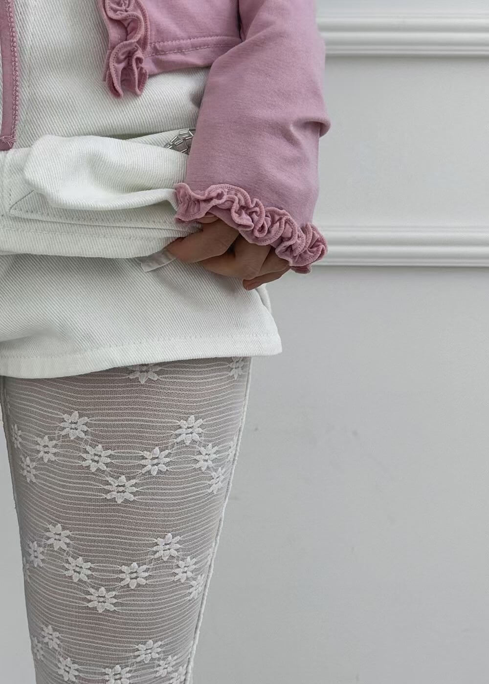 精緻的捏摺花邊在門襟和袖口的位子做為滾邊