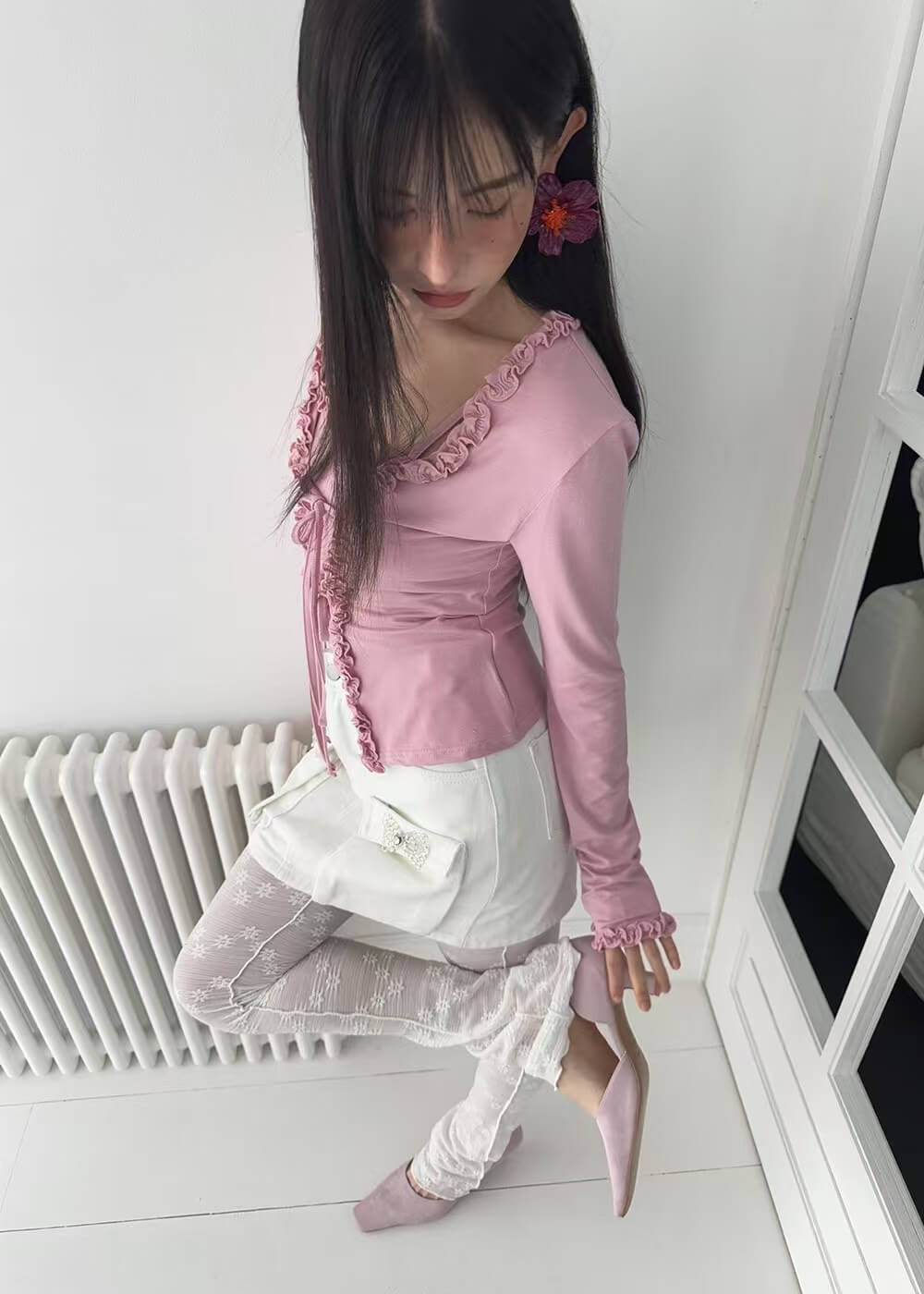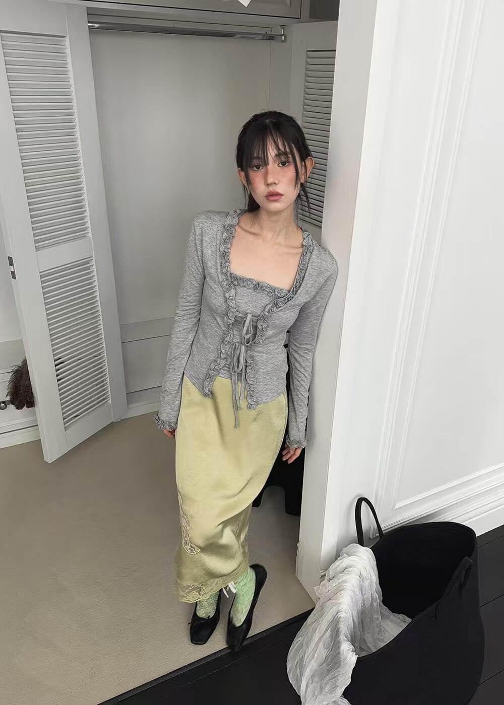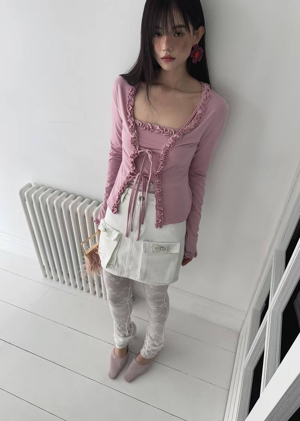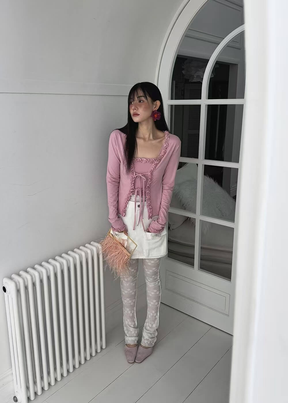 精緻的捏摺花邊在門襟和袖口的位子做為滾邊